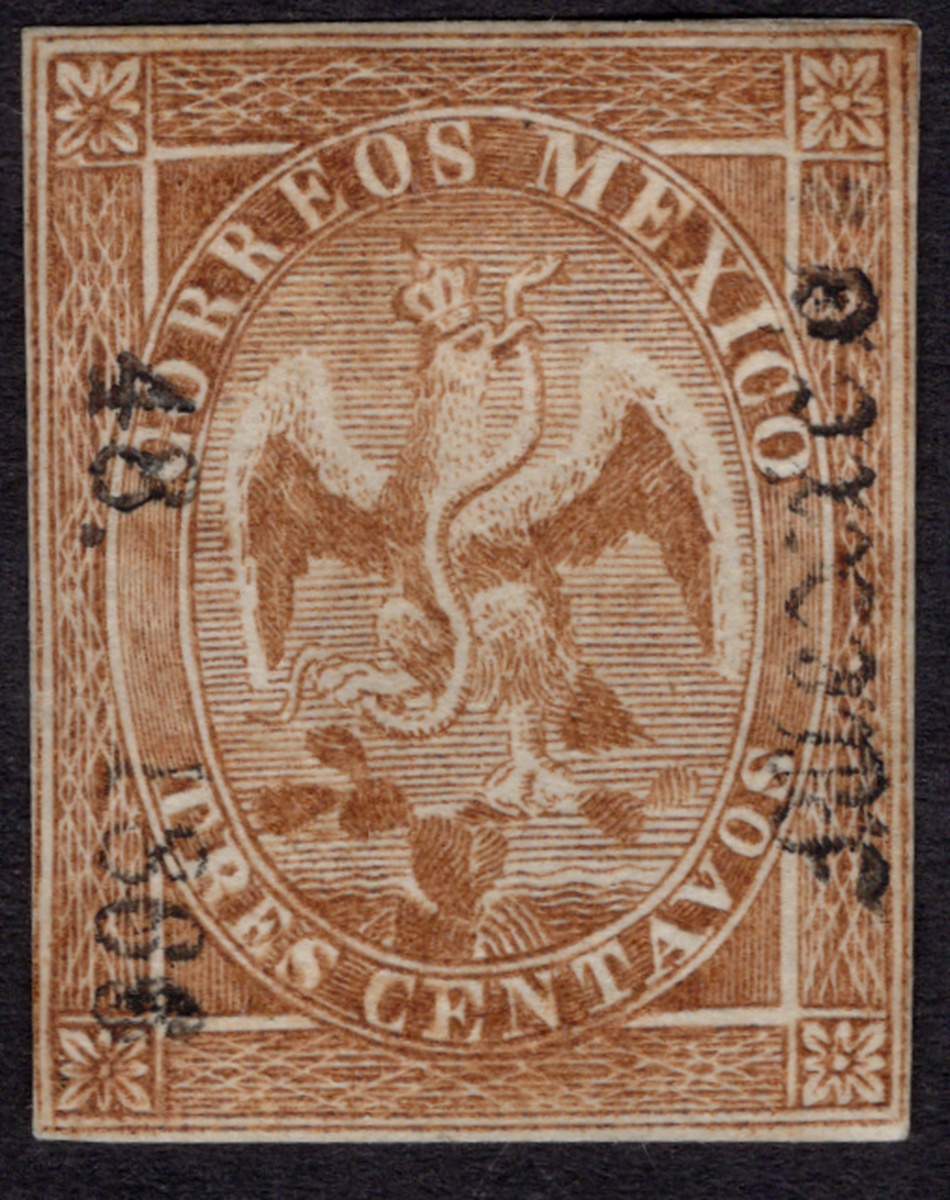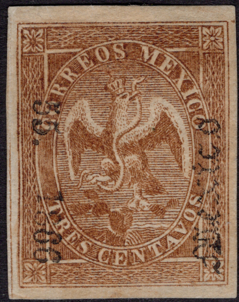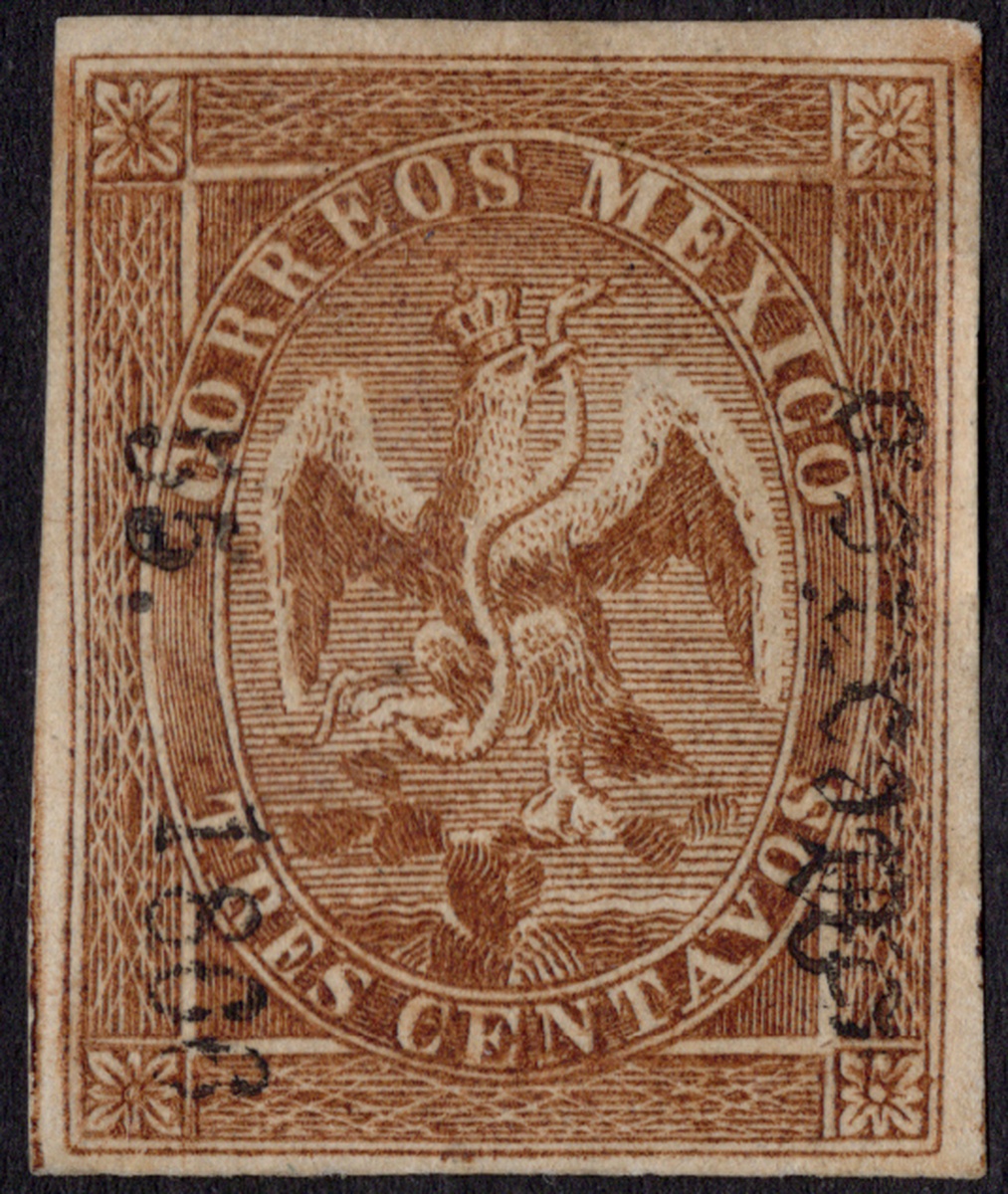158 Used   imageMexico. 1864 "Eagles". Mexico District 3c. Brown, 4th Period, consignment 71-1865, narrow margins and cutting into, used with c.d.s. A total of 2,403 stamps were printed for the Mexico City local mail experiment, with only 200 originating from this consignment. Cancelled examples of this denomination are exceptionally scarce, as most letters posted in the designated city mailboxes were left uncancelled; only those handed in directly at the post office received a cancellation. A good example and an essential piece of classic Mexico, being one of the likely fifteen known examples from any consignment that received an actual cancelation. 2023 MEPSI certificate. Scott 18, $3,250. (Image) (Image2) (All Images)