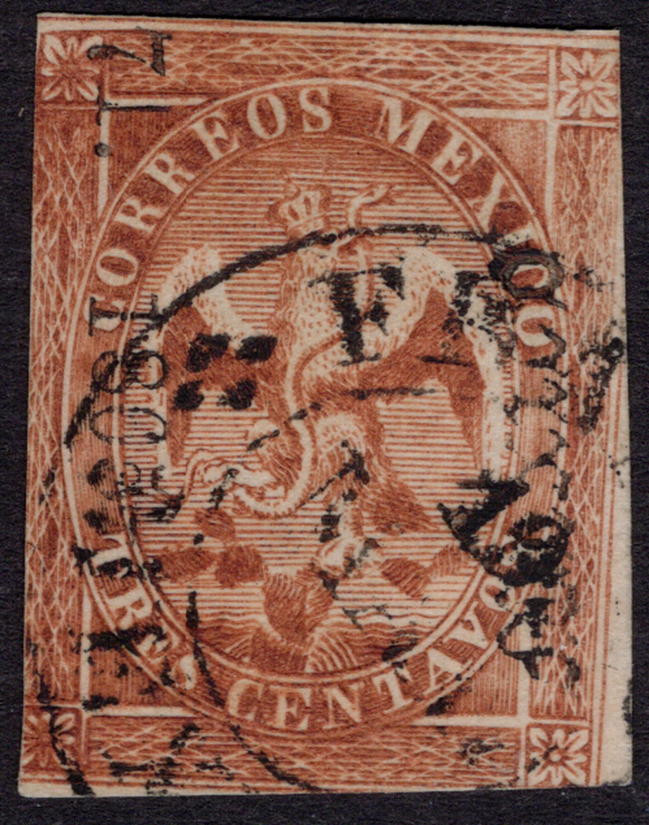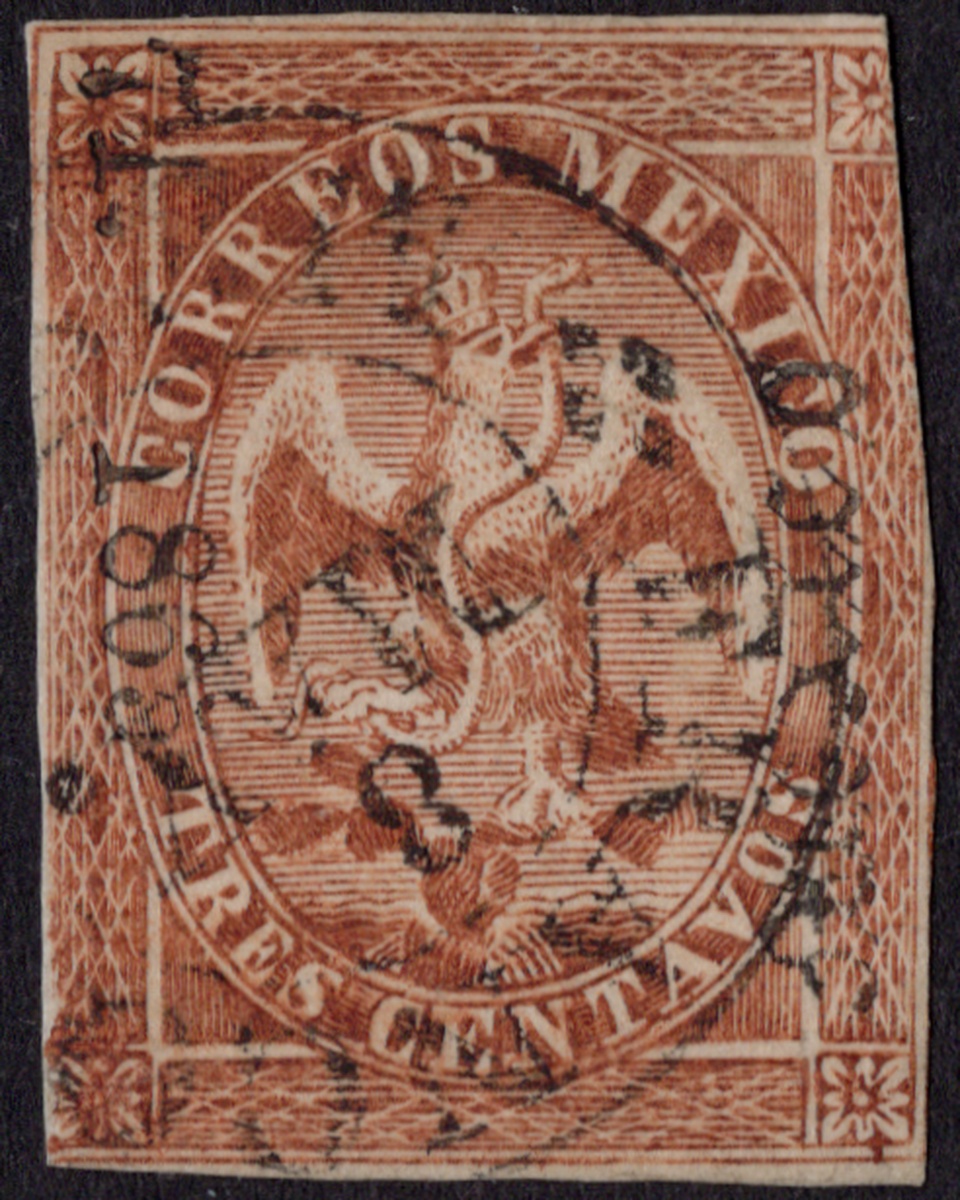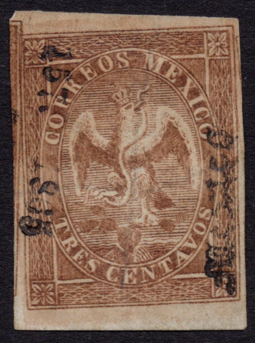 158 Used   imageMexico. 1864 "Eagles". Mexico District 3c. Brown, 4th Period, consignment 71-1865, narrow margins and cutting into, used with c.d.s. A total of 2,403 stamps were printed for the Mexico City local mail experiment, with only 200 originating from this consignment. Cancelled examples of this denomination are exceptionally scarce, as most letters posted in the designated city mailboxes were left uncancelled; only those handed in directly at the post office received a cancellation. A good example and an essential piece of classic Mexico, being one of the likely fifteen known examples from any consignment that received an actual cancelation. 2023 MEPSI certificate. Scott 18, $3,250. (Image) (Image2) (All Images)