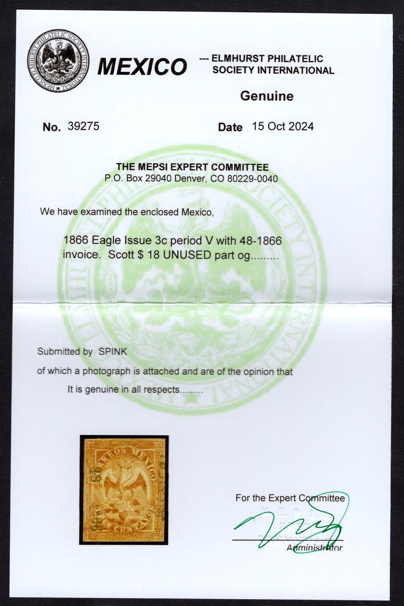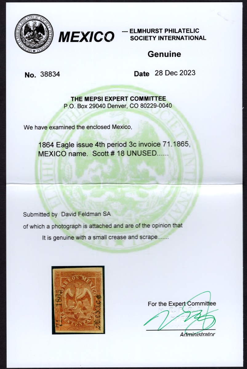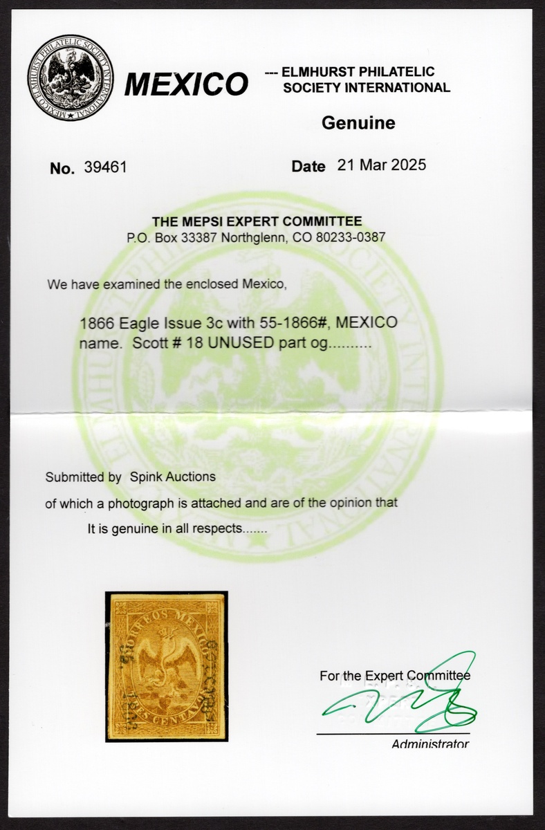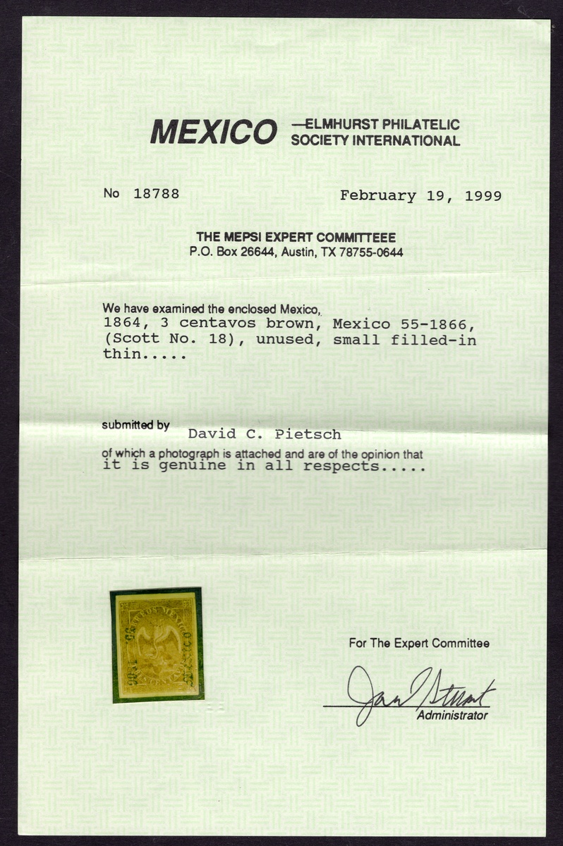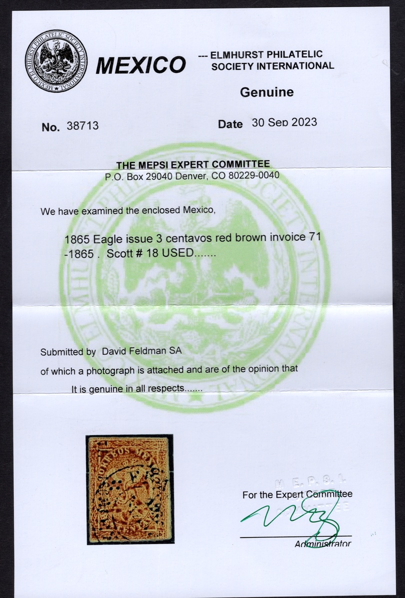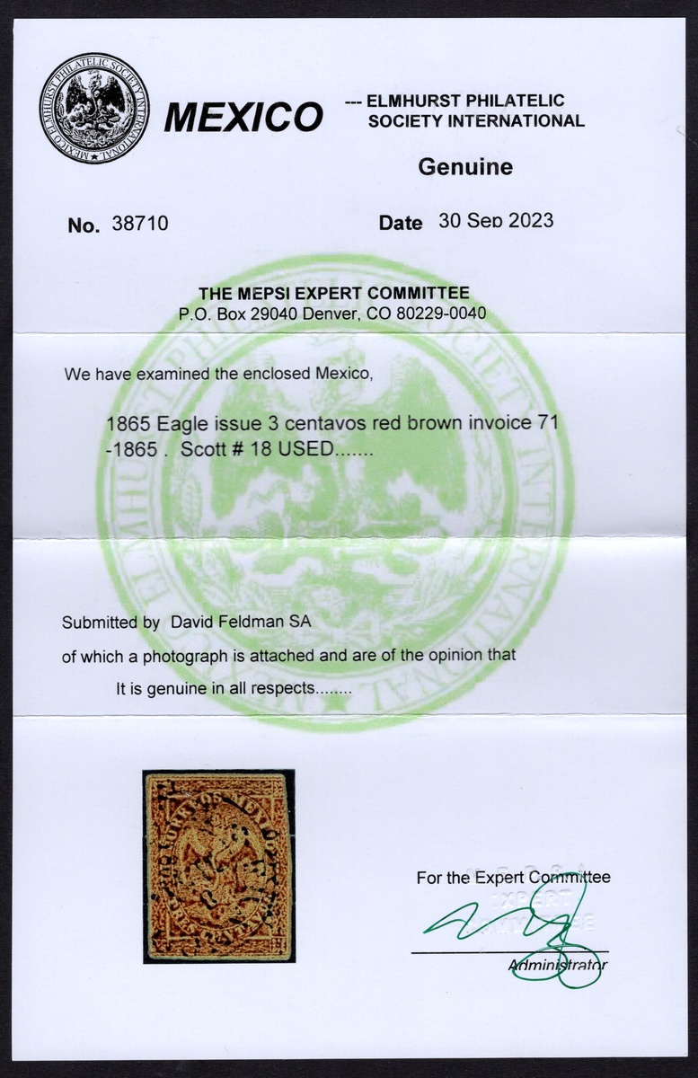 157 Used   imageMexico. 1864 "Eagles". Mexico District 3c. Brown, 4th Period, consignment 71-1865, narrow margins cutting into, used with c.d.s. 2,403 stamps were issued for the Mexico City local mail experiment, of which only 200 came from this consignment. The exceptional scarcity of cancelled examples of this denomination arises from the fact that most letters bearing this stamp, when deposited in the designated city mailboxes, were left uncancelled, with cancellations applied only to those presented directly at the post office. A desirable example and an essential piece of classic Mexico, being one of the likely fifteen known examples from any consignment that received an actual cancelation. 2023 MEPSI certificate. Scott 18, $3,250. (Image) (Image2) (All Images)
