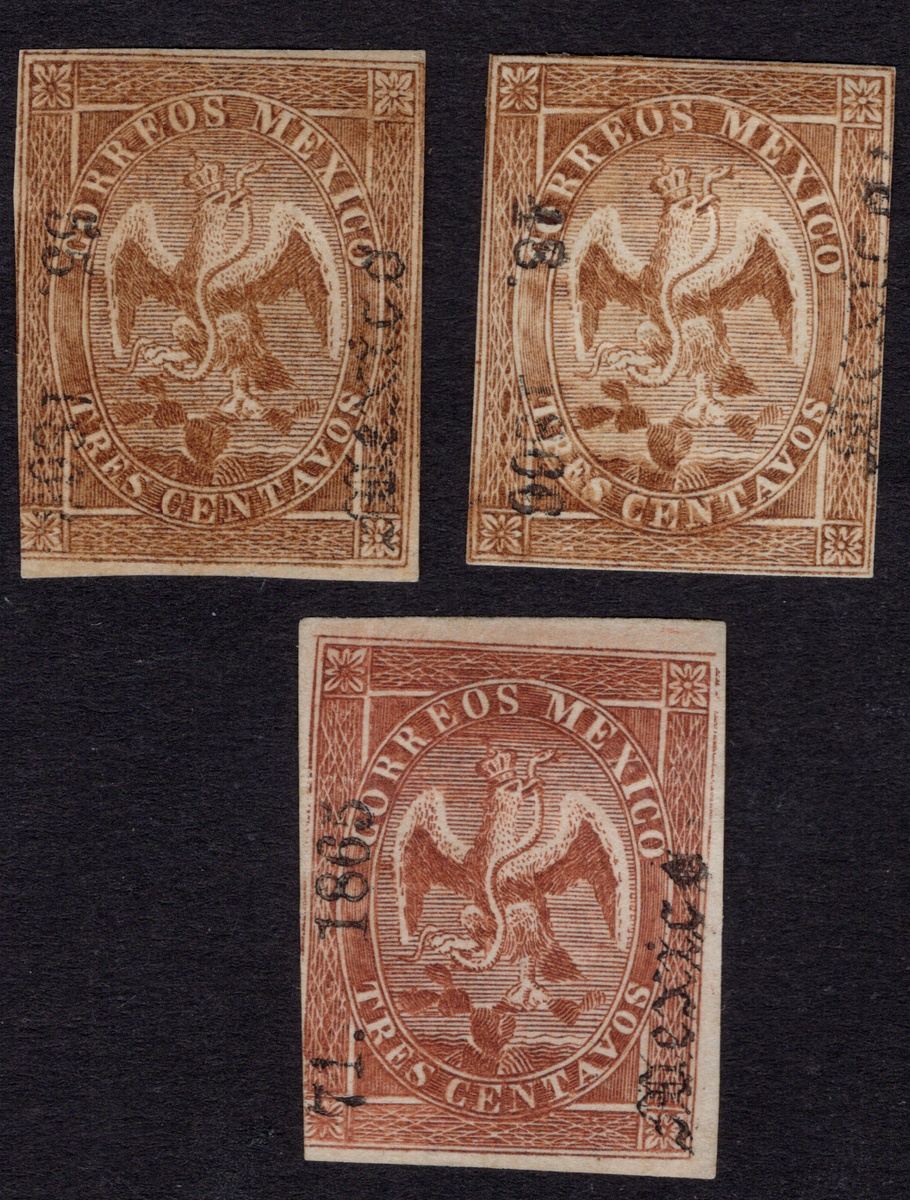 156   imageMexico. 1864 "Eagles". Mexico District 3c. Brown, trio of examples: #71-1865, #48-1866 and #55-1866, all in unused condition. #71 has good margins -just cut into at lower left-; #48 with tight margins with part o.g. and clear impression; #55 displays small margins and is cut into at lower left. Printed in a limited run of just 2,403 copies, this stamp was part of a trial issue intended for local city mail during 1865 and 1866. Two are accompanied by a MEPSI certificate (2023, 2024). Scott 18, $3,900. (Image) (Image2) (Image3) (All Images)