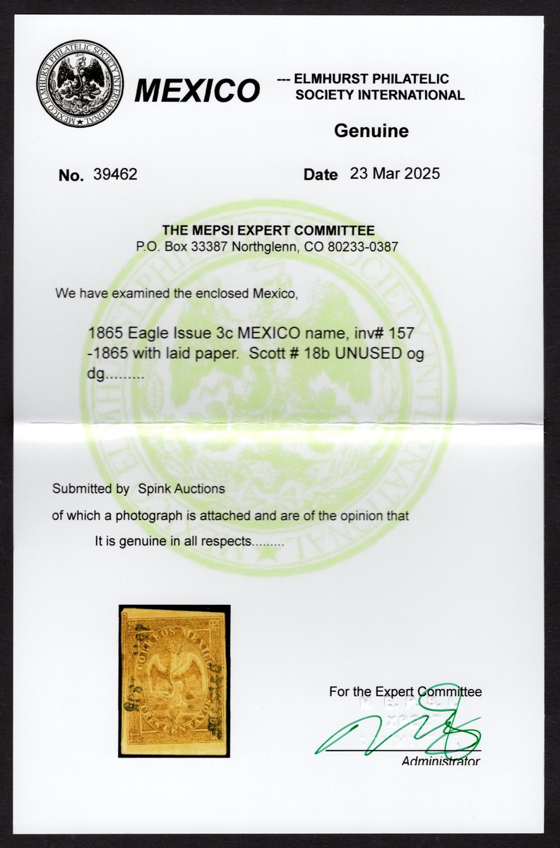 159   imageMexico. 1864 "Eagles". Mexico District 3c. Brown (#157-1865), laid paper, fourth period, unused with part o.g., margins all around, large at top and bottom, very fresh. This stamp was issued as an experiment for local city mail in 1866-1867, with only 2,403 issued. Just the stamps from this consignment, with a total of 100 issued, were printed on laid paper; among the few known, this is one of the most attractive examples. 2025 MEPSI and 1983 Jaretzky certificates, signed WE. Scott 18b, $4,500. (Image) (Image2) (All Images)