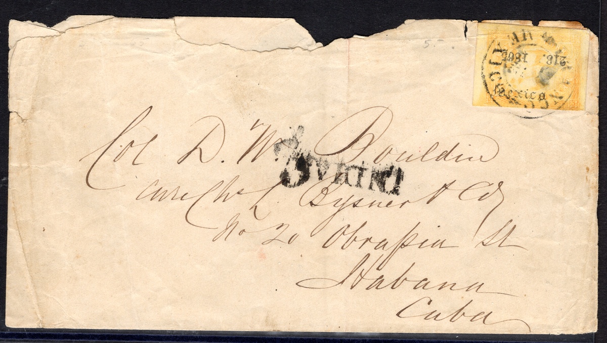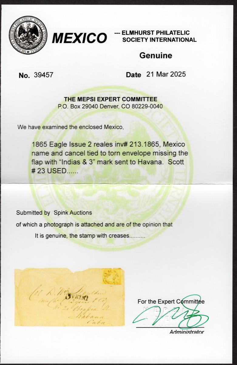 160   imageMexico. 1864 "Eagles". Mexico District 2r. Yellow (#213-1865), margins all around, featuring an uncommon maritime use on torn envelope (back flap missing) to La Havana, showing rare "Indias" and "3" postal markings. The stamp with some creases, not detracting. Very few covers are known to this destination. 2025 MEPSI certificate. Scott 23. (Image) (Image2) (All Images)