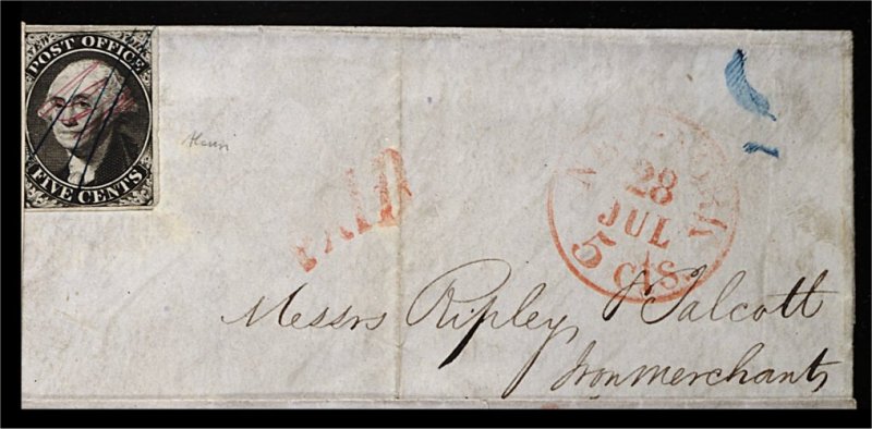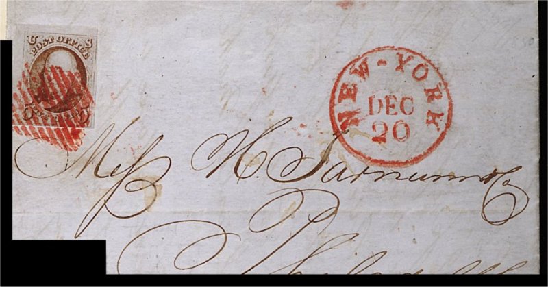 10 c 1 image#1, 5c Red brown, worn impression, full to enormous margins except very close at extreme tip of top right corner, tied by bold square grid in red on 1850 (Dec. 28) letter sheet to Philadelphia and showing matching "New York" origin c.d.s. adjacent, fine. (Image) 600.00