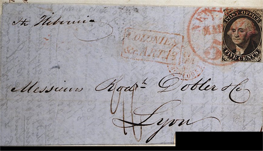 5 c 9X1e image#9X1e, New York, N.Y. 5c Black Postmaster Provisional, without signature, well tied by large "New York / 5" c.d.s. in red on 1846 (Mar. 31) letter sheet to Lyon, France (Apr. 19), sent via London (Apr. 15) with manuscript "p. Str. Hibernia", showing framed "Colonies / & Art. 13" h.s. in red adjacent, stamp has defective margin at top and light overall toning, nevertheless an attractive and scarce usage to an overseas destination. (Image) 2,250.00
