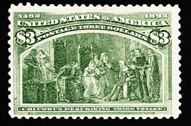 276 og 243 image#243, $3.00 Columbian, an unusually fresh and choice mint example, featuring extraordinarily large margins all around and being wonderfully well centered within them, deep rich color and a sharp detailed impression on immaculate paper, full clean o.g., lightly hinged, extremely fine; a premium quality Three Dollar Columbian; 1997 PF certificate. (Image) 2,400.00