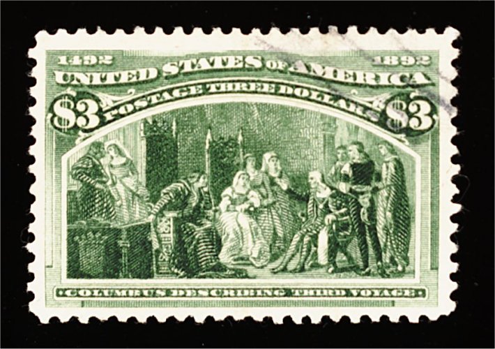 279 O 243a image#243a, $3.00 Columbian, the olive green shade, an extraordinary quality used example which possesses tremendous eye appeal, boasting uncharacteristically large margins and being wonderfully well centered within them, deep luxuriant color and impression on fresh paper (couple of very light offset lines on reverse from original cover), very light cancel confined to top right corner, extremely fine; a terribly challenging stamp to find so choice used; 1990 PF certificate. (Image) 1,000.00