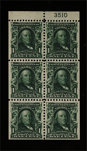 345 ogK 300b image#300b, 1c Blue green booklet pane of six, the very rare and highly collectable position D, showing plate no. 3510 in the selvage tab, only one position in the entire 180-subject sheet contained the plate number, with this particular example being in gem quality, featuring absolutely perfect centering and margins throughout, deep luxuriant color, strong intact perforations, o.g., lightly hinged, extremely fine; scarce in any condition, but especially so this choice; 1996 PF certificate. (Image) 1,250.00