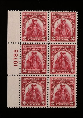 601 nhX 657a image#657a, 2c Sullivan, lake shade, an extremely rare left margin plate no. 19785 block of six of this distinctive color error, which has only recently been listed and priced in the Scott catalog, wonderfully fresh, with strong unmistakable color, well centered, pristine o.g., n.h., a very fine and choice example of this important 20th century plate block; 2001 PF certificate. (Image) 4,500.00