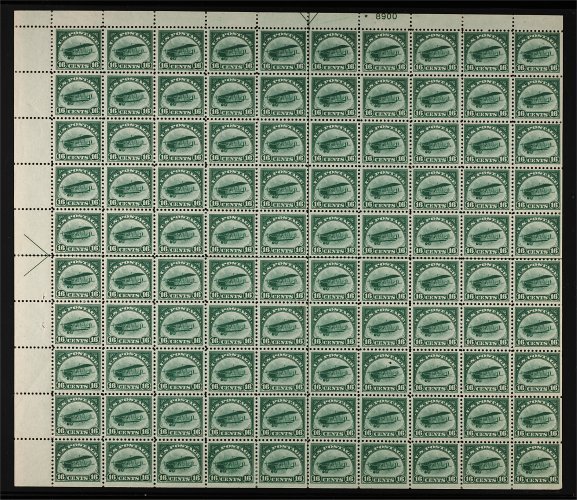 612 og/nhbl C2 image#C2, 16c Green, an impressive top left corner complete pane of 100, with full sheet selvages showing left and top arrow markings, as well as plate no. 8900, remarkably well centered throughout the sheet, with numerous stamps possessing exceptional centering within large margins, strong fresh color, unusually clean o.g. which is remarkably free of most of the usual gum bends and skips, hinge slivers sensibly placed on edges of sheet (only in selvages and on all s.e. stamps), rest of the sheet n.h., two stamps with insignificant thin specks, overall very fine-extremely fine; certainly one of the finest centered #C2 sheets still remaining intact. (Image) 15,000.00+