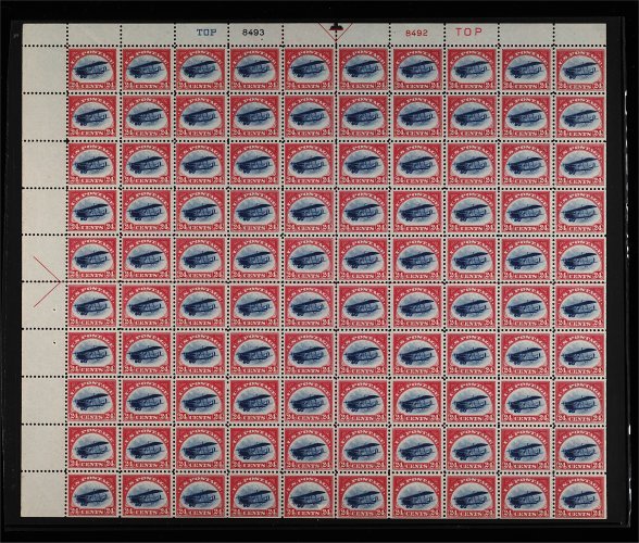 615 nhbl C3 image#C3, 24c Carmine rose and blue, a brilliantly fresh top left corner complete pane of 100, with full sheet selvages showing left and top arrow markings, as well as both "TOP" imprints and plate nos. 8493, 8492, in a remarkable state of preservation for a sheet of this vintage and value, possessing particularly vibrant colors and being exceptionally well centered throughout much of the sheet, reverse of the sheet is uncommonly clean as well, with far fewer natural gum bends than usual, o.g., n.h., just a few inconsequential perf. separations in left sheet selvage, centering ranges from fine on a very few stamps, to mostly very fine and extremely fine; in our opinion, this #C3 sheet is one of the finest quality sheets that still remains intact. (Image) 15,980.00+