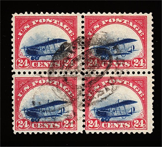617 Obl C3 var. image#C3 var., 24c Carmine rose and blue, "landing plane" variety, used block of four whose central vignette is shifted strongly to bottom, so that the plane's wheels touch or cut into the red frame line, while not technically the true "grounded plane" variety (wheels must touch "CENTS" lettering to qualify) this is an impressive shift nonetheless and is quite collectable, central double oval pmk., small faults which do not affect its fine-very fine appearance. (Image) Est. 150-200