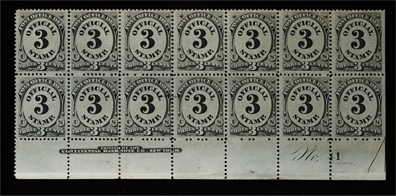 713 ogX O49 image#O49, 3c Official, a seldom seen full bottom margin imprint and plate "No. 41" block of fourteen, extraordinarily fresh and bright, quite well centered for a multiple of this size, strong color, full clean o.g., several stamps n.h., one row with sensible hinge reinforcement of a few separated perfs., very fine for this; terribly undercataloged when one considers how infrequently one sees Official plate blocks of any value. (Image) 125.00