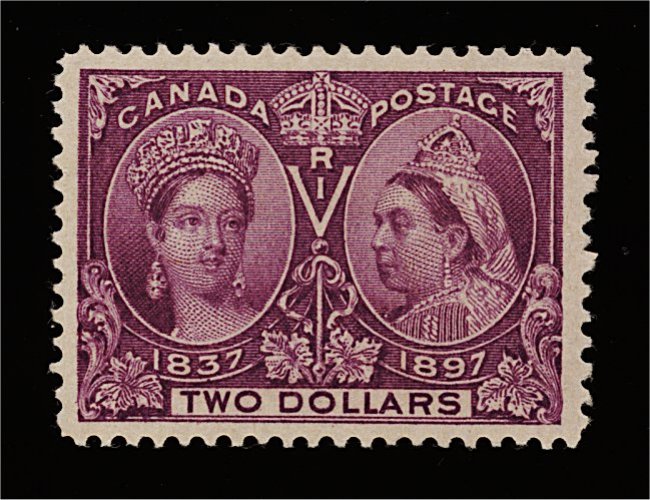 964 og 62 image#62, 1897 $2.00 Jubilee, an impressively margined mint single, possessing extraordinarily wide margins which are most uncharacteristic of this value, well centered, luxuriously rich color and a sharp impression on bright paper, full clean o.g., lightly hinged, extremely fine (Unitrade C$1,600.00). (Image) 875.00