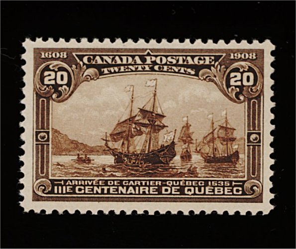 978 nh 103 image#103, 1908 20c Quebec Tercentenary, well centered within exceptionally large margins, intensely rich color, o.g., n.h., choice very fine; a particularly handsome stamp (Unitrade C$750.00). (Image) 450.00