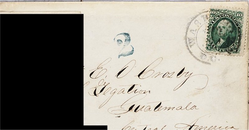 91 c 68 image#68, 10c Yellow green, centered to left and a few short perfs. at bottom, tied to 1863 (July 24) envelope from Washington, D.C. to Guatemala, cancelled by c.d.s. and showing handstruck "2" in blue adjacent, a fine example of this scarce destination. (Image) Est. 200-300