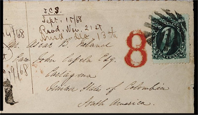 92 c 68a image#68a, 10c Blue green, centered to left, tied to 1868 envelope addressed to Carthagena, United States of Colombia, tied by very fine strike of ornamental leaf cancellation, showing handstruck "8" in red adjacent, with "New York Paid All / Br. Transit" and "A / Colon" c.d.s. on reverse, partly overwritten by contemporary docketing, a fine and handsome cover to a scarce destination. (Image) Est. 200-300