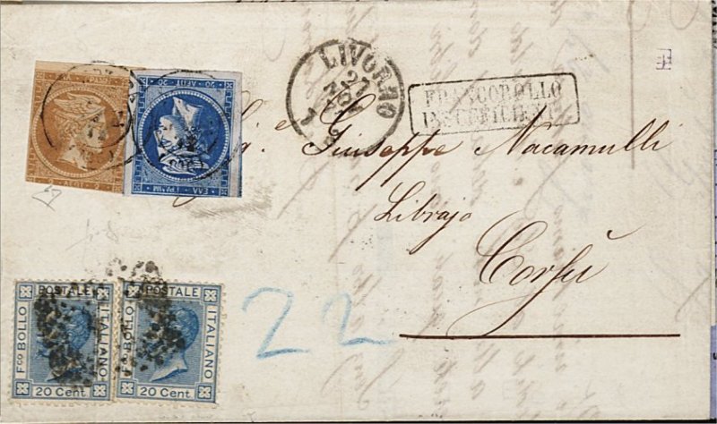 1062 c 17a, 36 image#17a, 36, 1862-67 2lep. Brownish bister and 1870 20lep. Blue, both with large to just touched or cut into margins, applied as Postage Dues and cancelled by "Kerkyra" arrival c.d.s. on 1871 entire from Livorno to Corfu, franked at origin with Italy 1867 20c Blue (#35) singles (2) cancelled by numeral in lozenge and showing framed "Francobolli / Insufficienti" h.s. adjacent, scarce combination cover, fine; signed E(nzo) D(iena). (Image) Est. 400-500