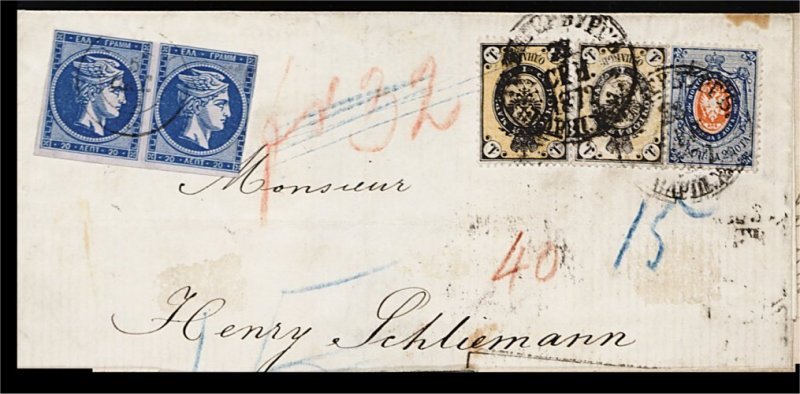 1064 c 40 image#40, 1872 20lep Blue on thin paper pair, varying margins (large to cut into), applied as Postage Dues and tied by arrival c.d.s. on 1872 entire from St. Petersburg, Russia, to Henry Schliemann (the archaeologist who rediscovered Troy) in Athens via Trieste, franked at origin with Russia 1866-70 1k (2) and 20k (#19, 24) and tied by c.d.s., a few minor age spots, nevertheless a handsome cover; 1997 Robineau certificate. (Image) Est. 500-750