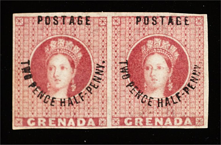 1067 og 9a image#9a, 1875-81 2 1/2p Lake imperforate, horizontal pair, in a lovely rosy lake shade, full to large margins, o.g., very fine; a rarely offered imperforate; 1976 PF certificate (S.G. #22a; £800+). (Image) 850.00+