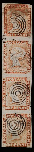 1080 O 3c image#3c, 1848 1p Orange red, worn impression on grayish paper, a rare vertical strip of four still showing some detail in the Queen's head and fairly distinct background lines, full to large margins all round except extreme tip of top right corner just encroached upon, tiny tear in margin at left just impinges on frame of 2nd stamp, some transparent grease staining, overall a very fine and remarkable multiple representing the right hand vertical row of the sheet; 1972 PF certificate (S.G. #17; £1,700+). (Image) 1,500.00+