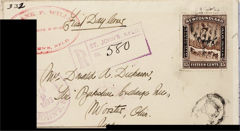 1108 F 211 image#211, 1933 "L. & S. Post." overprint on 15c Brown, tied to choice registered first day cover by grid pmk., violet "Registered/Feb 9, 1933/St. John's Nfld." double ring c.d.s. at bottom left, with matching boxed registry handstamp, red oval sender's cachet at top left, various backstamps, very fine; a seldom seen early first day. (Image) Est. 150-200