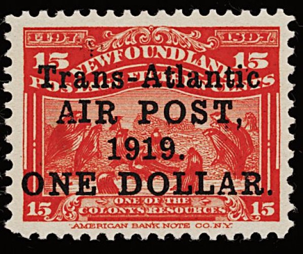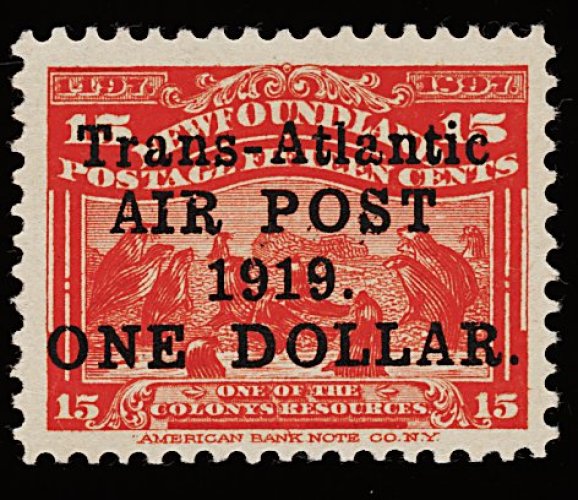 1109 nh C2 image#C2, 1919 $1.00 Air post surcharge on 15c Scarlet, a gem mint single for the perfectionist, perfectly centered amid very large margins, radiant color, unblemished o.g., never hinged, extremely fine (S.G. #143; for hinged £110). (Image) for hinged 175.00
