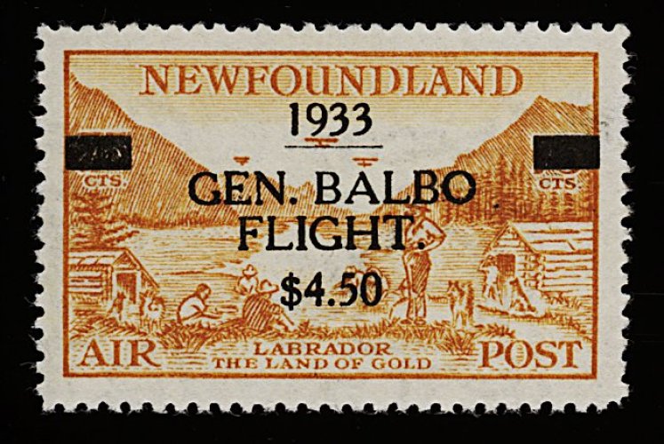 1112 nh C18 image#C18, 1933 $4.50 on 75c Balbo flight surcharge, a highly select mint example of this scarce stamp, featuring outstanding centering amid huge margins, brilliantly fresh and crisp, o.g., never hinged, an extremely fine gem; 1997 CPES certificate for a block of four, this being the top right stamp (S.G. #235; for hinged £250). (Image) 475.00