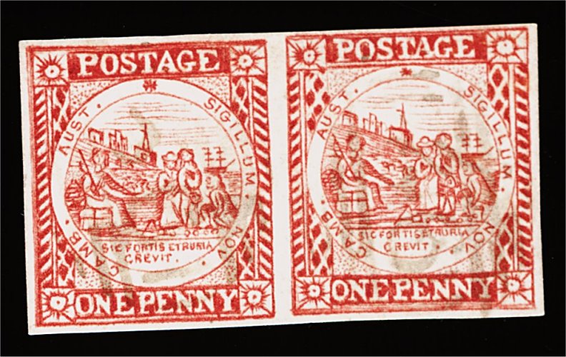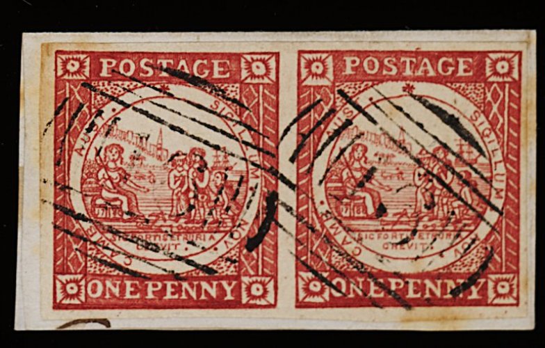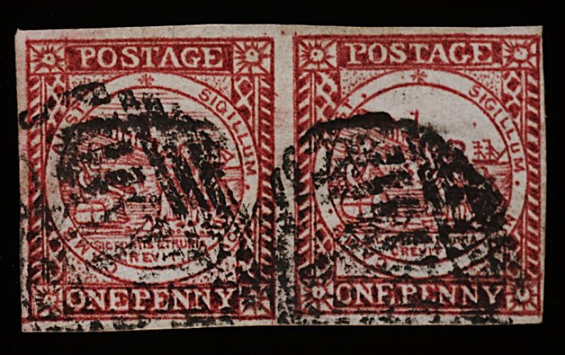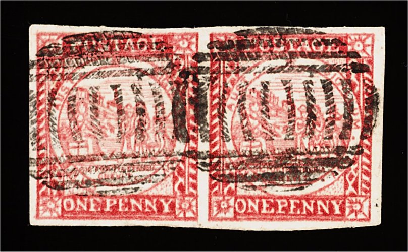 1114 O 1 image#1, 1850 1p Reddish rose, Plate I, no clouds on soft yellowish paper, horizontal pair, exceptionally fine and detailed impression in bright clear shade which provides further enhancement to it sharpness of detail, large margins all round, lightly cancelled "16" on piece, with manuscript docketing "Wellington, 12/1/50" which confirms the very early printing and use of this stamp, slight marginal staining in places, otherwise very fine and a striking pair; 1959 RPS certificate; ex-Amundsen (S.G. #3; £750+). (Image) 800.00+