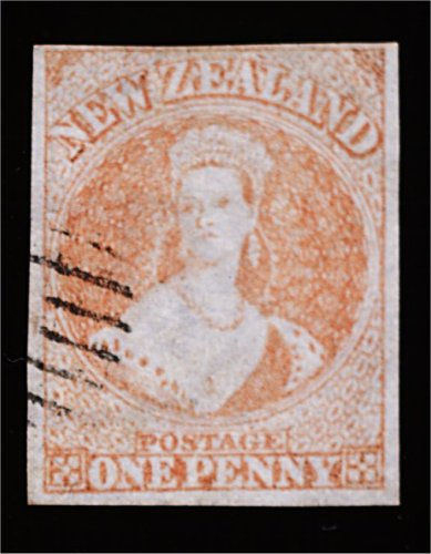 1146 O 4 image#4, 1855 1p Orange red on blue paper, unwatermarked from the Auckland Printing, these rare and desirable printings can be found with parts of the papermaker's name in double lined letters, this example contains an almost complete double lined "E" at center left, an extremely attractive four margin copy, close at top with the remaining superbly full and even, a light unobtrusive face-free partial grid cancel, very fine for this; signed Holcombe and accompanied by a 1989 Brandon certificate (S.G. #4; £1,500). (Image) 1,750.00