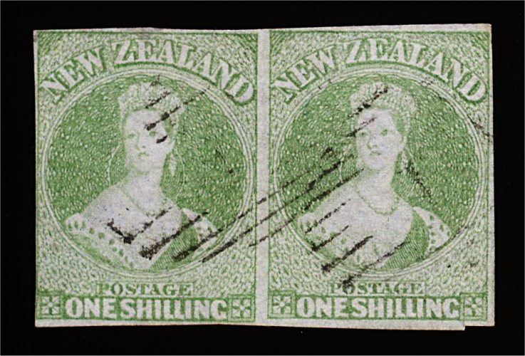 1147 O 6 image#6, 1858 1/- Green on blue paper, horizontal pair cancelled with light grid handstamps, close but four clear margins all around, the right stamp has a unobtrusive horizontal crease a top and a trivial margin cut at bottom, still remarkably attractive and desirable as few pairs in this condition from the Auckland Printings exist (S.G. #6; £7,000+). (Image) 8,500.00+