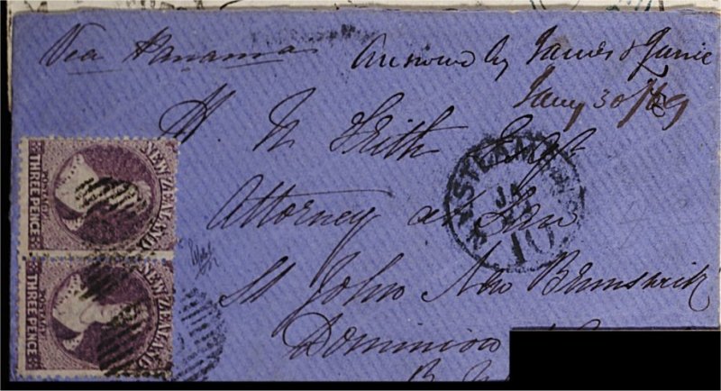 1148 c 33 image#33, 1863-64 3p Lilac watermark star, perf. 12 1/2, horizontal pair on 1868 (Dec. 25) envelope from Dunedin to St. Johns, New Brunswick, cancelled "18" in oval of bars and showing "N.Y. Steamship / 10" transit c.d.s. adjacent, with departure and arrival c.d.s. on reverse, a highly appealing cover to an unusual destination; 1988 Holcombe photo opinion (S.G. #117). (Image) Est. 400-500