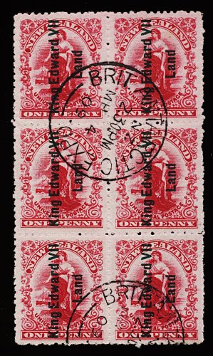 1150 O 121a image#121a, 1908 1p Rose carmine overprinted "King Edward VII Land" in green, vertical block of six (2x3) with "Brit. Antarctic Expd./MR 4 09" c.d.s.; in 1908 a quantity of the 1p Rose carmine stamp of New Zealand was overprinted "King Edward VII Land" and taken on the Shackleton expedition to the Antarctic, due to weather conditions the expedition never reached its destination and landed at Victoria Land instead, the stamps were used aboard the expedition ship, Nimrod, and at the Cape Royds base in McMurdo Sound; while cancelled this is a n.h. item as it was sold to the public at a premium, upper left stamp has trivial crease, very fine (S.G. #A1; £210+). (Image) 240.00+