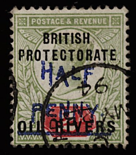1154 O 51 image#51, 1894 "1/2" Blue surcharge on 1p Vermilion, used, bright color, portion of Opobo River c.d.s., fine; 2000 BPA certificate (S.G. #64; £350). (Image) 250.00