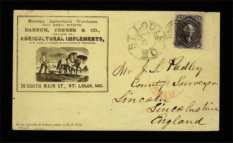 104 c 78c image#78c, 24c Blackish violet, a single with fine centering and rich unmistakable Blackish violet color, tied to an absolutely gorgeous canary-colored illustrated advertising cover for "Barnum, Fenner & Co./Agricultural Implements" by black target postmark, matching clear "St. Louis, Mo. Oct (?)" c.d.s. along side, addressed to Lincoln, England, red transit c.d.s. and backstamped, cover with two minute and inconsequential tears at top, a very fine and lovely cover franked with the enormously rare and undercataloged Blackish violet shade, which is one of the rarest and most difficult stamps of the entire 19th century to find in any condition off cover, let alone on this beautiful advertising cover; the Scott catalog only lists and prices this stamp used off cover at $1,750.00, and this evaluation is terribly low considering its true rarity; the penultimate #78c cover; illustrated in Lester G. Brookman's The United States Postage Stamps of the 19th Century, Volume II (figure 88, page 58); signed Stanley B. Ashbrook. (Image) Est. 3,000-4,000