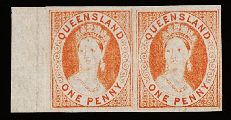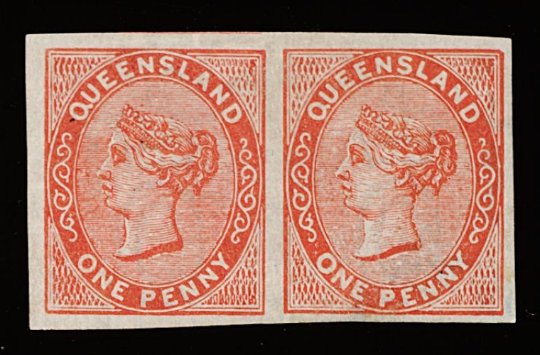 1189 og 10 image#10, 1863 "FOUR PENCE" surcharge on 6p Carmine imperforate, very scarce horizontal pair from the left of the sheet, vivid color, large even margins, o.g., extremely fine; the first such pair of this imperforate we have seen (S.G. #5; £1,000+). (Image) 1,000.00+