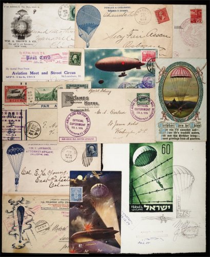 1335 ogOc imageParachute stamps and covers of the world, an unrivaled massive collection formed by Dr. Charles E. Pugh, being the most remarkable assemblage one could imagine of anything philatelic related to parachutes, including stamps, cancels, post cards, covers, collateral, etc., the bulk of the collection is housed in 24 huge binders and contains approximately 8,000 to 9,000 covers and post cards, plus there is a large stockbook housing hundreds of stamps which depict parachutes (many scarce items noted including imperforates and large die proofs) and another stockbook filled with related vignettes, labels and cinderellas; the covers and post cards together form a complete history of the parachute from its early invention in the 19th century to modern 20th century commemorative envelopes, included in this group are very early and desirable illustrated United States advertising covers depicting parachutists and balloonists, there are early pioneer parachute drop covers from the U.S. and abroad by some of the most famous people in the field, there are an incredible number of lovely early picture postcards, WWI and WWII propaganda cards (again all depicting parachutes), there are autographs, documents, special event covers, reunion covers, even a piece of a parachute; all organized by country, with strongest sections being U.S., France, Germany, Great Britain, Italy, Japan, Poland and Russia; the collection is actually a compilation of the two largest such collections in the world, the material formed by Dr. Pugh and that of his close friend, Sidney Jackson, one of the key historical figures in the history of modern parachutes, who bequeathed his collection to Dr. Pugh upon his death; truly this collection is without a doubt one of the most remarkable "topical" collections we have ever seen, and we are certain those bidders that take the time to review the collection in its entirety will agree with our opinion and determine that our estimate is clearly on the conservative side; we have photographed only a tiny fraction of the items found in this unique assemblage to give potential bidders a sampling of the many unusual items found in the collection. (Image) Est. 7,500-10,000