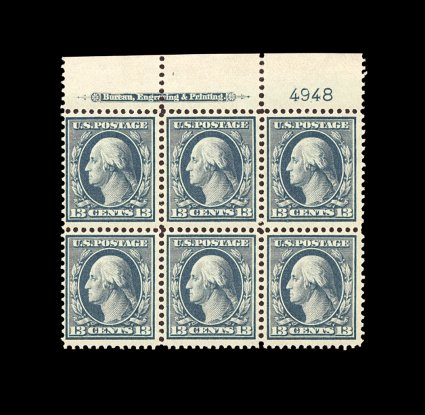 1344 nhPB 339 image#339, 13c Blue green, top margin imprint and plate no. 4948 block of six, beautiful fresh color on bright white paper, o.g., n.h., selvage just slightly reduced at top, very fine; 2000 PSE certificate. (Image) 800.00