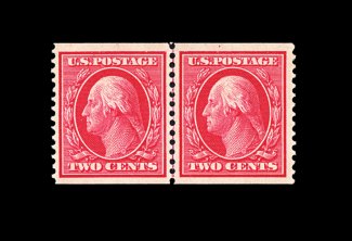 1352 og 353 image#353, 2c Carmine coil, perf. 12 vert., a remarkable quality guide line pair, being one of the finest examples of this surprisingly challenging and scarce line pair we have encountered, possessing outstanding centering amid unusually wide margins, gorgeous intense color and an excellent clarity of impression, pristine o.g., n.h. on right stamp (accompanying certificate states left stamp is "previously hinged" - an opinion with which we respectfully disagree), extremely fine; a gem line pair for the finest collection; 2003 PF certificate. (Image) 750.00