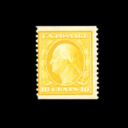 1355 og 356 image#356, 10c Yellow coil, perf. 12 vert., fresh mint single, brilliant color, clean o.g., lightly hinged, a fine example of this coil rarity; photocopy of a 1985 PF certificate for a pair, this being the right stamp. (Image) 2,750.00