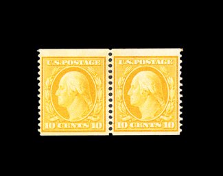 1356 og 356 image#356, 10c Yellow coil, perf. 12 vert., pair, well centered, bright fresh color, o.g., a very fine example of this rare coil pair; light Mekeel guarantee handstamp on reverse, as well as being accompanied by 1970 and 1997 PF certificates. (Image) 7,000.00
