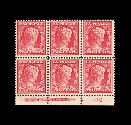 1359 ogPB 369 image#369, 2c Lincoln on bluish paper, bottom margin imprint, star and plate no. 4979 block of six, well centered, fresh color, o.g. (some minor disturbance at top), a few reinforced perforations, a very fine example of this scarce plate block; clear 2000 PF certificate. (Image) 2,900.00
