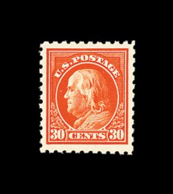 1408 nh 439 image#439, 30c Orange red, marvelous mint example, wonderfully well centered within large margins, strikingly intense color and a deeply incised impression, pristine o.g., n.h., extremely fine; an eye-catching gem; 2003 PF certificate. (Image) 550.00
