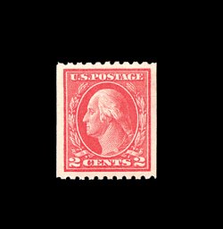 1409 nh 442 image#442, 2c Carmine flat plate coil, perf. 10 horiz., the "perfect" coil single, flawlessly centered amid huge margins (including at top and bottom), gorgeous radiant color and impression on immaculate paper, unblemished o.g., n.h., a superb gem for the collector who seeks the ultimate in quality; photocopy of a 2001 PF certificate for a strip of six from which this stamp was taken. (Image) 19.00