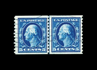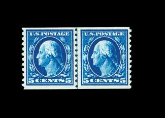 1416 O 447 image#447, 5c Blue flat plate coil, perf. 10 vert., scarce used pair, intensely rich color and impression, uncharacteristically light machine cancel, very fine; 2003 PF certificate. (Image) 300.00