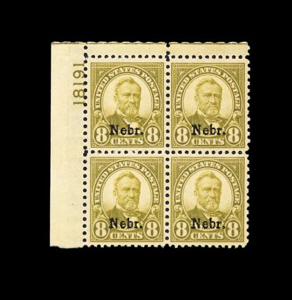 1483 ogPB 677 image#677, 8c "Nebr." ovpt., top left corner plate no. 18191 block of four, exceptionally well centered for any "Kans.-Nebr." plate block, strong color, o.g., lightly hinged, a few perf. separations at right, extremely fine. (Image) 400.00