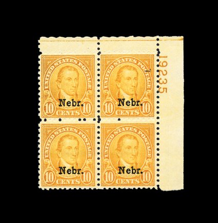 1485 ogPB 679 image#679, 10c "Nebr." ovpt., top right corner plate no. 19235 block of four, nicely centered, strong color, o.g., lightly hinged, small mark on top right stamp, otherwise very fine. (Image) 950.00