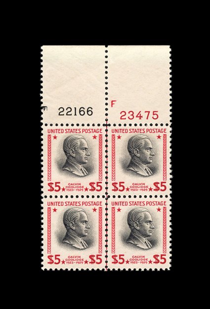 1487 nhPB 803-34 image#803-34, 1/2c-$5.00 Presidentials cplt., plate number blocks of four, each handpicked for choice centering and freshness, o.g., n.h., an extremely fine and especially select set of plate blocks. (Image) 690.60