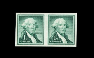 1489 og 1054b image#1054b, 1c Dark Green coil, imperforate, pair, large balanced margins all around, bright and fresh, o.g., lightly hinged, tiny natural paper inclusion in top left margin, extremely fine; a very rare imperforate coil pair, as only 13 pairs are recorded according to the Datz catalog; as a further indication of rarity, the massive William S. Floyd collection of modern errors did not contain an example of this; 1991 PF certificate. (Image) 2,500.00