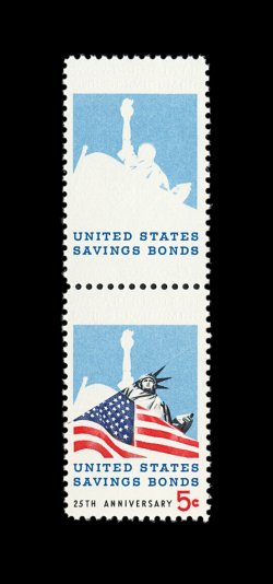 1491 nh 1320b image#1320b, 5c Savings Bond-Servicemen, red, dark blue and black omitted, the top stamp in a highly desirable transitional vertical pair, with the bottom stamp showing partially omitted colors as well, well centered, o.g., n.h., extremely fine; one of the premier missing color errors in existence, as only a mere six examples are known; 1989 and 1991 PF certificates. (Image) 4,250.00+