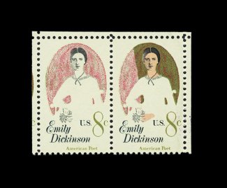 1495 nh 1436b image#1436b, 8c Emily Dickinson, pale rose offset color omitted, the left stamp in a horizontal transition pair, with the right stamp with partially missing colors, a fabulously rare modern error with only three or four examples known, the missing pale rose color is actually a flesh color, the absence of which results in Emily Dickinson's face and hands being totally colorless, additionally the dark green background is nearly totally and strikingly omitted, the right stamp has a portion of the pale rose and dark green background colors omitted, well centered, o.g., n.h., extremely fine; the first example of this color omitted error we have offered in our auctions; 1975 APS certificate as a block of four, this being the top pair, and a 1991 PF certificate as a pair; ex-Hewitt. (Image) 7,500.00+